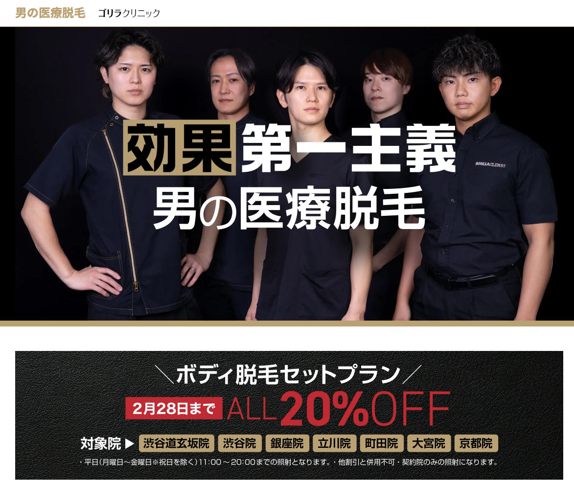 まさに男性美容・脱毛のパイオニアとして、業界を切り開いて来たゴリラクリニックは、他のクリニックでは到達できない脱毛技術力の高さを保有しています。利用者様にとっては、施術実績が一番の安心感・信頼感に繋がっているようです。